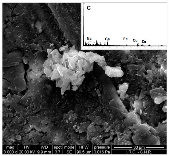 Figure 5 (and its inset) show the results provided by SEM with EDX (energy-dispersive X-ray spectroscopy) analysis applied to the whole particulate before solvent extraction. SEM analysis was not successful in providing information on the morphology of the samples, mainly composed of heterogeneous blocks. Nevertheless, the EDX-based approach was instrumental in making evident the dominant presence of carbon, with traces of metals (probably released from the arc electrodes).