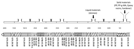 The formulations have been fulfilled in one single step with a co-rotating twin screw extruder (Leistritz ZSE18, L/D = 60, D = 18 mm), with the screw profile described in Figure 1.