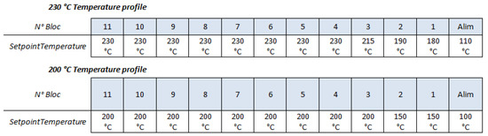 Two different temperatures profiles have been used, one at 230 °C and the other one at 200 °C, both with lower temperatures for the first blocs to minimize clogging effects at the inlet. These temperature profiles are described in Figure 2.