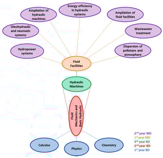 When the structure of the hydraulic engineering was analyzed at the UPV, there was a complete interweaving with other matters in their different bachelor’s and master’s degrees. These subjects (Figure 1), which were distributed throughout student training, were: (i) basis subjects in hydraulics and fluid mechanics; (ii) subjects related to hydraulic machines; (iii) subjects related to hydroelectric plants and wind power machinery; (iv) subjects related to hydraulic facilities; (v) materials in oleo hydraulic and pneumatic systems; (vi) matters in relation to the water-energy binomial; (vii) matters in computational fluid dynamics (CFD) modeling; (viii) matters in relation to the hydraulic aspects of wastewater treatment; and (ix) matters in relation to the dispersion of contaminants in receiving fluid media.