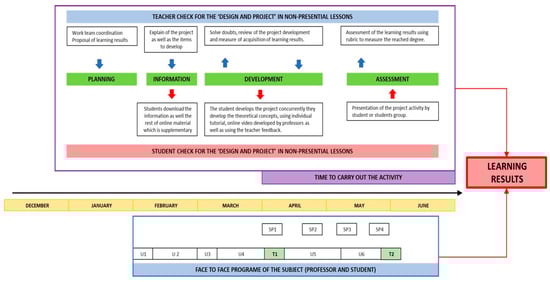 Time planning was proposed for each subject and it must be followed by both students and professors through the different phases. These steps (Figure 2) were divided on face-to-face and non-face-to-face lessons. The first phase allows students to know the theoretical concepts throughout the master course, the development of computer practices as well as the development of basic problems related to the taught issue. Once these are known, the learning results of each unit should be practiced in progressive development of the project. This practice is non-face-to-face and the students must use information from the UPV webpage. In this section, they have supplementary material. Along this phase, the students work on self-learning and the professor gives them help in group meetings. The collaboration between the professor and students improves the acquisition of the learning results.