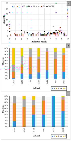 Figure 3b,c shows the transposition from the mark to transversal competence in the different subjects that participated in the teaching project (Table 2). If observing the topic hydraulic machines (12659), 77% of students reached the A and B descriptors when the “Design and Project” competence was evaluated. Similar results were obtained in the rest of subjects shown in Figure 3b.