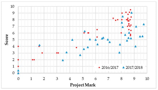 Figure 4 shows there is a lineal relationship between exam and project marks in two years (i.e., 2016/2017 and 2017/2018). Therefore, the development of the activity helped students to acquire the hydraulic concepts as well as the methodology. Although there were no exams when PBL was applied, in order to compare the previous (traditional method using master courses) and new methodology (CPBL), an exam was proposed. This improvement contributed to reaching the learning results favorably. This trend was observed in majority of the studied subjects. Besides, when the project delivery was after the exam, the test mark did not have a relationship between them. Therefore, there was a greater significance to establish the date delivery before the test. The final marks were compared with previous years. The score increased around the 1–2 point about 10, reducing the number of students who failed the subject (6% in 2016/2017 and 8% in 2017/2018).