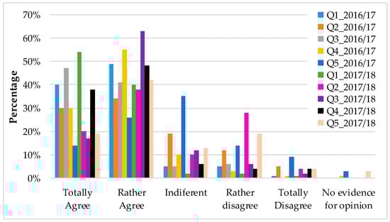 Figure 5 shows the results in the survey when it was done in hydraulic machines. The figure shows the results once 103 students (76%) answered it. There were 90% of students that positively agreed with Q1. This percentage was higher compared with other subjects in the UPV. This was a goal of the project, since it wanted to develop activities to increase the satisfaction in the students. These activities were focused on: (i) increasing the simulation lessons with software, (ii) visiting some buildings where the students can identify the studied facilities, and (iii) increasing the number of online videos in which they can visualize real solved case studies. In both years, the answer was similar between students. Therefore, they considered positive the use of this methodology to apply the teaching concepts.