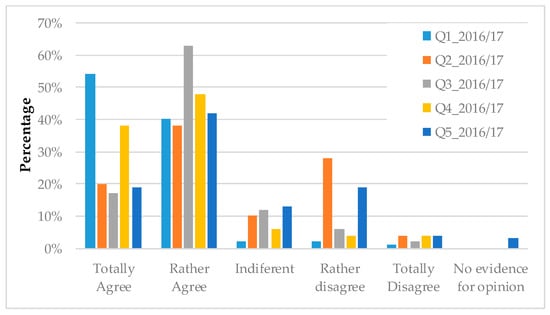The rest of the questions were mostly approved. They showed the majority of students agreed to develop the teaching methodology. Similar results were obtained in fluid facilities (Figure 6). The surveys analysis showed the student accepted this methodology although they had to invest more effort in the subject continuously. This learning obligated students to develop a planning to reach the objectives. In this case, results from only one year were presented, since the Master’s students only undertook a course in the active methodology in 2017 (previously, they undertook a course in for their Bachelor’s degree on the topic hydraulic machines using this teaching project).