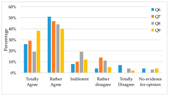 Figure 7 shows the results of a survey, which had four questions. The survey was proposed to students in the second-year or third-year level (once the student studied fluid mechanics). The questions measured the vertical coordination between subjects. The questions (Table 4) were related to: (i) the developed project that helped students to improve the acquisition of competences (Q6); (ii) if the development of the project, which was developed on fluid mechanics in the previous year, helped to improve the development of the project in hydraulic machines (Q7); if the previous study of the hydraulic concepts helped students to develop the project (Q8); if the use of a similar methodology between the project developed both fluid mechanics and hydraulic machines that helped students to develop the project in the hydraulic machines topic (Q9).