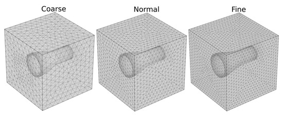 The finite element mesh used is an unstructured tetrahedral mesh for simplicity of set-up. A mesh-independence study was completed for all simulations using three mesh densities labelled “coarse”, “normal”, and “fine”. Figure 2 shows example mesh densities with their corresponding number of elements. These mesh densities are tested to ensure that the obtained solution is independent of the mesh resolution (as demonstrated in Section 3.2). The velocity field is solved for using a stationary incompressible flow solver. The solver is based on the Reynolds-averaged Navier-Stokes (RANS) equations for conservation of mass and momentum. The flow equations are solved in conjunction with the k-ω turbulence model known to give a good compromise between accuracy and numerical stability [13]. The k-ω turbulence model used is based on the Wilcox revised model with realizability constraints whose equations could be found in [14]. As for the wall treatment, the model applies an automatic wall treatment, meaning that it switches between low-Reynolds-number treatment and wall function based on how the flow near to the wall is well resolved. This allows a good compromise of the benefits of the two treatments including accuracy of the low-Reynolds-number treatment and robustness of the wall function.