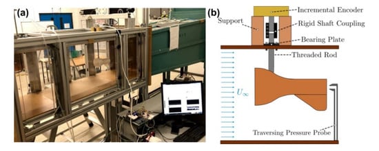 Figure 3 shows the wind-tunnel setup used for experimental measurements. The model was mounted to an overhead bearing plate using a 10 mm threaded rod, allowing free rotation in yaw as would be experienced in field tests. The angular position was measured using an incremental optical encoder (incremental shaft encoder type RI 58 by Hengstler). The encoder was then connected to a National Instruments myRIO data acquisition card running LabVIEW software, recording the angular time-histories of the model with respect to the freestream velocity vector through the test section. The model was placed at the centerline of a 455 × 455 mm2 cross-section low-speed open-circuit wind tunnel that can be driven up to 20 m/s by a centrifugal fan.