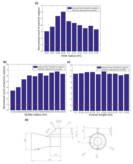 The sampler main function is to act as an air multiplier concentrating the airborne particles through the sampler contraction. To demonstrate this functionality of the sampler, Figure 4a–c show the normalized rates of particle capture compared with a baseline case of particles passing through an equivalent area at the sampler outlet (without the presence of the sampler). For given average wind speeds and particle counts (as defined in Section 2.2), a parameter sweep was conducted for the inlet radius, outlet radius, and funnel length changing one parameter at a time whilst keeping the other two parameters at constant values. Note that these parameter sweeps were conducted with no bullet section included. However, the starting point for this parameter sweep exercise was the known dimensions for the bullet section as these dimensions were imposed by the sensory system requirements. Each parameter was varied over an extended range until no significant enhancement in performance could be obtained.
