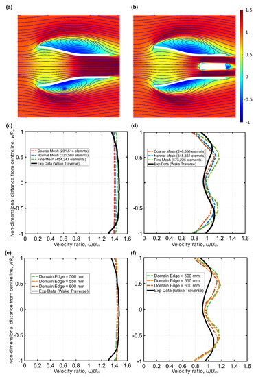 Figure 5a,b show the simulation results for the x-velocity field map for the sampler device without and with the bullet section, respectively. More importantly, Figure 5c,d show the combined results for a mesh-independence study for the simulation and the experimental findings from wake traverse measurements. In this demonstration, the horizontal axis shows the velocity profile ratio (i.e., velocity normalized by the freestream value). The vertical axis represents the normalized position from the sampler centerline, using the outlet radius as reference. The case of an empty outlet with no bullet carrying sensor instrumentation is shown in Figure 5c. Comparison of numerical and experimental wake profiles is shown 60 mm behind the sampler outlet where the traverse experimental measurements were taken. Mesh independence is broadly achieved with the normal mesh, though the fine mesh agrees more closely in the mid region with the values obtained experimentally. For the fine mesh, the overall wake profile from the simulation agrees well with that obtained experimentally showing a deviation of less than 5% throughout, validating the methodology adopted.