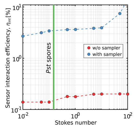 Numerical particles Stokes numbers were changed by varying their diameter and simulations were repeated numerous times allowing the evaluation of the interaction efficiency,, defined in Section 2.4. This evaluation permits insights into how well the sampler performs in capturing particles that actually interact with the biomimetic surface. Figure 6 shows the interaction efficiency percentage against particle Stokes number for the cases where the sampler is used and where the bullet section is allowed to hover without the sampler. The Stokes number range considered was . It is evident from Figure 6 that when no air multiplier (i.e., sampler) is used, the probability of interaction is relatively insensitive to Stokes number (note that the y-axis is plotted using a logarithmic scale). This insensitivity suggests that those particles whose streamlines at the inlet are aligned with the sensor surface will strike it, and that these make up approximately 0.1–0.2% of those initially released. On the other hand, when the sampler is deployed, the odds of interaction significantly improve to between almost 3% to 3.5% before sharply increasing to 7.4% and 14% for Stokes numbers of 50 and 100, respectively. Note that, Pst spores are known to be almost spherical and to possess a Stokes number of approximately 0.15 [19] (green line in Figure 6) suggesting that the interaction probability odds can be improved by a factor between 20 and 25 times, demonstrating the effectiveness of the developed device.