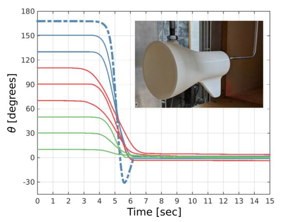 Figure 7 documents the angular time history measured for the sampler to assess its weathervaning performance. The blue lines track the movement of the sampler from initial setting angles relative to the oncoming flow in the range of , with the maximum considered, highlighted in bold and dashed. Red lines indicate the cases where the funnel was initially set in the range of , and green lines document those cases where the initial angle falls between . Note that denotes the sampler angular position relative to the free stream velocity. It was found that during the start-up process of the wind tunnel, as the sampler gets subjected to cross-flows between 3.5 and 4 m/s, it will re-orient itself to face the oncoming flow typically within 2 to 3 s in all cases, demonstrating a convenient response time.