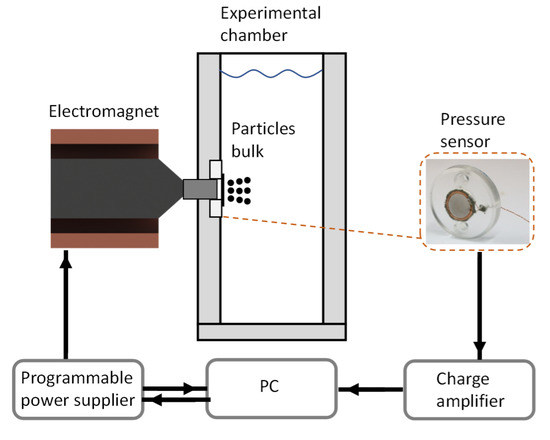 To focus on the behaviour of the particles in a pulsating electromagnetic field, the experiment was performed in a neutral system: a system that eliminates factors that could affect the particles, such as moving walls and induced flow. In the experiment, suspended particles were attracted to a sidewall using a pulsating magnetic field. The behaviour of the particles was qualitatively analysed using video records of (CamRecord 1000, Optronis, Kehl, Germany). In addition, the pressure that the particles applied on the sidewall during their attraction was measured, using an in-house piezoelectric pressure sensor.