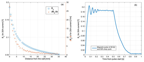 Characterization of the electromagnetic field. (a)—Electromagnetic field and its gradient, against distance from the inner wall. (b)—The pulse of the electromagnetic field varies in time.