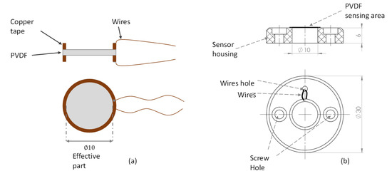 The in-house pressure sensor. (a) Illustration of the wired polyvinylidene fluoride PVDF unit; (b) drawing of the sensor and the housing.