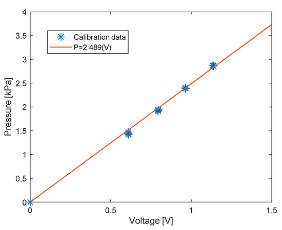 The sensor was calibrated in the experimental chamber using increasing hydrostatic pressure. Initially, the chamber was filled with water to the same height as in the experiment. Subsequently, the pressure in the chamber was increased to a desired level, each time from the same initial pressure. The duration until the pressure reached the desired level was approximately . The pressure increase was measured with a pressure calibrator (Presscal Pressure Calibrator PC105, Beamex, Pietarsaari, Finland), and compared with the signal difference from the charge amplifier. The calibration was performed after every replacement of the nylon cover. A typical calibration curve is presented in Figure 4.