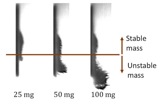 Figure 6 shows that the greater the amount of the particles, the farther that the unstable mass settles; this observation is attributable to the cluster behaviour of the unstable mass in a viscous medium. The normalised gravity/buoyancy force, per amount of particles, is equal for all the amounts. However, the larger amounts create larger clusters, on which the normalised drag force is weaker. Therefore, in the balance between the gravity/buoyancy force and drag force, the drag force becomes less dominant in larger clusters. Hence, the larger unstable mass settles faster.