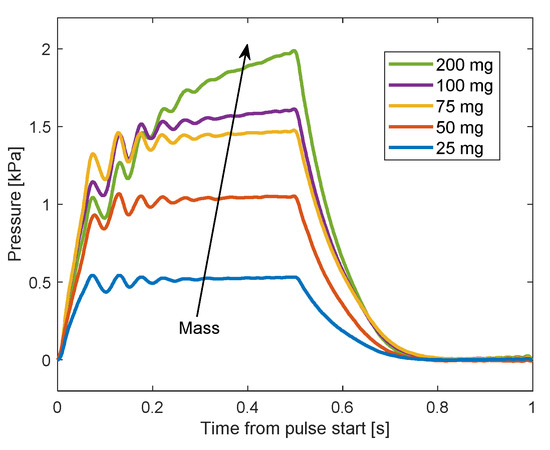 For different applications, smaller particles might be required. Cardiac pacing, for example, requires particles smaller than , instead of as were used for the feasibility of the application [7]. The sidewall pressure applied by three amounts of particles was measured in a similar procedure as that of the particles. The results of the sidewall pressure of the and particles during the 20th pulse are compared in Figure 15. The sidewall pressure that the particles applied was lower than that of the particles, but with a difference of less than , for the three amounts. It is possible that such difference is only attributable to the fine-tuning of the different parts of the system. Therefore, the influence of particle size on pressure is not clear for the particles studied. Further research with smaller particles is required to determine the influence of particle size on the sidewall pressure.