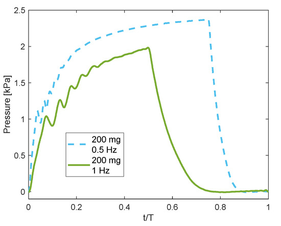 Pressure results during two shapes of pulses for the amount of 200 mg of particles.