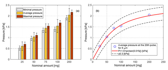Results of the maximum pressure difference at the 20th pulse, for different amounts. (a)—Min, Average and Max of each set of measurements. (b)—The average of each set of measurements, with a correlation.