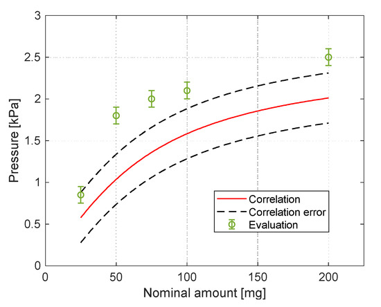Here, is the amount of the particles, and it varies in the range 25–200 mg. The agreement of the correlation to the results is presented in Figure 12b. The horizontal axis is the nominal amount of the particles, and the vertical axis is the average sidewall pressure at the 20th pulse for a given amount. The fitting suggests that asymptotic sidewall pressure exists, although that pressure was not achieved experimentally. By the correlation, the maximum sidewall pressure is .