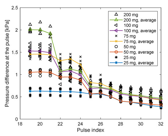 To investigate the influence of the duty cycle on the sidewall pressure, the duty cycle was reduced gradually from to during the pulses 20–32. The reduced duty cycle implies the increased duration of the field being turned off. As the duty cycle was reduced, the unstable masses settled lower and could not be collected again when the field was turned on. As a consequence of the loss of the particles, the measured sidewall pressure was reduced. The results of the sidewall pressure measurements during the reduction in the duty cycle are presented in Figure 14 for the 5 amounts of particles. The horizontal axis is the chronological number of the pulse (as in Figure 11), and the vertical axis is the maximum pressure difference in the pulse; the beginning is with the 19th pulse to focus on the pulses in which the duty cycle was reduced; each black marker refers to another amount of particles and includes the multiple repetitions for the amount. The colored and marked trend lines show how the average sidewall pressure of each amount changes with the reduction of the duty cycle. It appears that three pulses for each duty cycle may be insufficient to achieve the developed form and repeatable sidewall pressure; therefore, the discussed results are only of duty cycle reduction from (the developed form) to . A significant decrease in the measured pressure occurred only at the 22nd pulse, instead of at the 21st pulse. The reason is that the 22nd pulse is the first one that occurs after the field was turned off; therefore, before that pulse, a critical mass settled far away. The decrease in the sidewall pressure during the 22nd pulse was higher for larger initial amounts of particles, supporting the previous discussion in that larger unstable masses settle faster. It was also discussed that the stable mass should be the same regardless of the initial amount of the particles. While the duty cycle was reduced to , most of the particles were settled and not attracted again. Hence, the particles at the final pulse can be regarded as the “stable mass.” It appears that the final sidewall pressure at the 32nd pulse is almost the same for all the amounts of particles. Hence, it can be concluded that the stable mass is indeed not dependent on the initial amount of the particles.