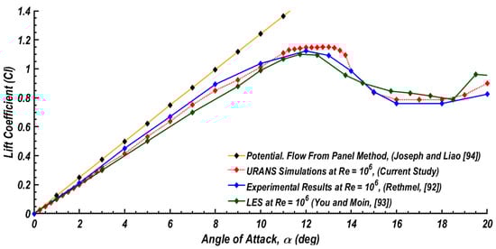 - An increase in the angle of attack led to the increase of the lift coefficient until the maximum of 1.15 at α = 13° is reached. The lift coefficient then sharply dropped for further increase in the angle of attack. Before stall, The slope of the lift versus incidence angle,, was approximately a constant at about before the stall. After the stall incident angle, decreased significantly, leading to a lift coefficient of 0.79 at α = 17°.