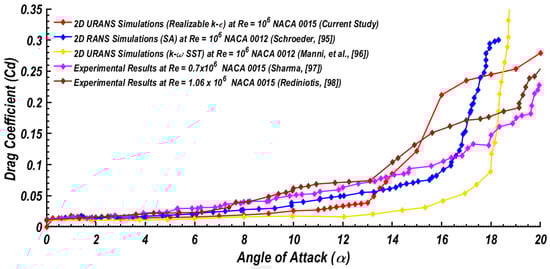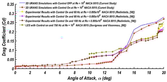 - At zero angles of attack, the drag coefficient was small but increased gradually with to 0.038 at the stall condition. The slope of the drag variation with the angle of attack, , was approximately constant at about 0.003. After the stall condition, the drag increased sharply with the increase of the incident angle of attack to attain a value of 0.28 at = 20°. The slope of the drag against the angle of attack, , increases to 0.04 after the stall condition.