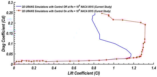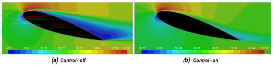 - Flow features around the NACA 0015 airfoil were significantly improved for the control-on state. This is clearly seen by comparing contours of static pressure, x-velocity, and turbulence kinetic energy around the airfoil at AoA = 16° for the control-off state with those of control-on state. For the control-on case, the flow separation regions over the airfoil upper surface were found to reduce significantly. The turbulence kinetic energy was also much reduced by the activation of the synthetic jet actuators. At AoA = 16°, the lift coefficient increased by about 67% and the stall angle of attack increase by 3°.
