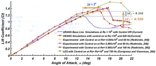 - Amitay, M.; Glezer, A. Role of Actuation Frequency in Controlled Flow Reattachment over a Stalled Airfoil. AIAA J. 2002, 40, 209–216. [Google Scholar] [CrossRef]