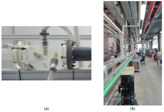 Once air and water pass through the mixing section, the resulting two-phase flow is directed to the test section, consisting of a 24 m long horizontal pipeline composed of 13 PMMA, 60 mm bore tubes, connected by means of sealed flanges, suitably designed to minimize the misalignment within a tolerance of 0.5 mm (Figure 3b). Furthermore, the pressure taps have been placed at a distance of at least 10 diameters from the flanges, to further dampen the disturbance caused by connections, as confirmed by the smooth behavior of the pressure along the pipeline. The loop closes on the supply tank, where the two-phase mixture is immediately separated by gravity. The test section is equipped with 4 pressure taps evenly distributed along the pipeline and connected to a differential pressure transducer.