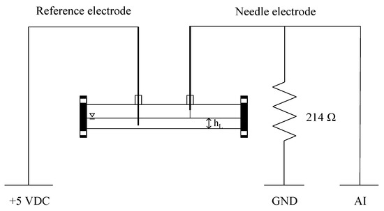 Concerning the void fraction, a resistive probe was used to measure the liquid layer height. The measuring apparatus (electrical scheme in Figure 4) is a modified version of the one developed by Kim and Kang (1992) [33] and reported also in [34] and [35]. It is a single-tip, external-electrode resistive probe that consists of: (1) a needle electrode introduced radially from above into the flow, through an open pressure tap and by means of a probe support endowed with a ruler to provide the immersion depth, and (2) a second wire, submerged through a second pressure tap into the liquid phase, that acts as a reference electrode. Both the reference electrode and the probe stem itself are very thin, so their disturbance on the liquid flow is completely negligible. The needle electrode is insulated, using a non-conductive ceramic painting, apart from the final tip that is the sensing part. The reference electrode is connected to a +5 V power supply, while the needle is connected to an analogue input of the acquisition board and grounded through a resistor. The choice of connecting the reference electrode and not the probe to the +5 V power supply is to avoid any possible electrowetting phenomena, with negatively charged water attracted towards the positively charged probe and consequent distortion of the measure.