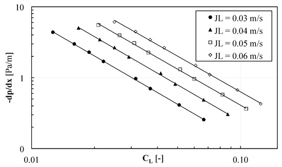 It is observed that each data series is linearly correlated, which is consistent with the theory. The slope of the straight line represents the so-called distribution parameter , which accounts for non-uniform phase distribution on the pipe cross-section (uniform flow: ), and ranges from 1.20 to 1.30 as increases.