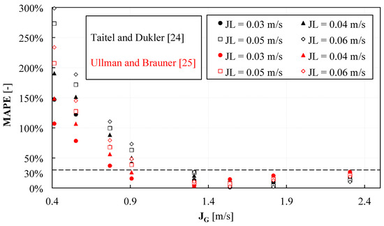 No matter the model adopted for the interfacial shear stress, Equations (6) and (7) are solved simultaneously to determine both the pressure gradient and the void fraction. Figure 8 shows the mean absolute percentage error (MAPE) as a function of the gas superficial velocity. It is seen that MAPE values lower than 30% are found for . Below this value, the disagreement strongly increases as far as the gas superficial velocity is lowered and the liquid superficial velocity is increased. It is worth noting that the Ullman and Brauner model [30] performs better than the Taitel and Dukler [17] for , but MAPE remains unacceptably high for and , suggesting that the cause of the disagreement still lies in the representation of the interfacial shear stress.