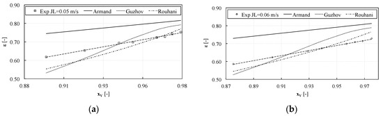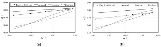 The measured void fraction is reported against the volume quality in Figure 9 and Figure 10, where it is also compared with some models from the literature. However, as shown in Figure 9 and Figure 10, none of the implemented correlations satisfactorily predicted the void fraction in the whole range of superficial velocities, even though a similar trend can be found with the Armand correlation.