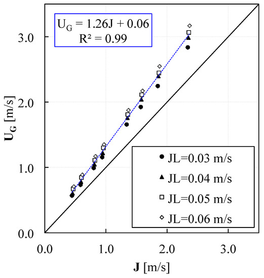 Accordingly, Figure 11 shows the actual velocity of the gas phase, evaluated as against the mixture velocity , for the different liquid superficial velocities.