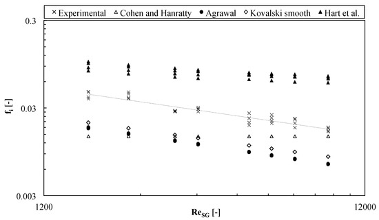and plotted against the superficial gas Reynolds number as shown in Figure 13, where it is compared with some literature models suitably developed for stratified smooth/wavy flows, namely Cohen and Hanratty [44], Agrawal [16], Kowalski [45] and Hart et al. [24]. The fitting curve is: