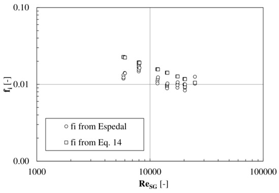 The two-fluid model momentum equations were rearranged to account for pipe inclination. It resulted that the interfacial friction factor for small inclination angles does not vary considerably compared to the horizontal layout, so that Equation (14) would still apply. The Espedal data [36] were processed as indicated above in the Section “Interfacial shear” in order to evaluate the interfacial friction factor. The comparison, reported in Figure 14, shows that Equation (14) tends to overpredict the data, with MAPE = 35% and MPE = −34%. The data refer to the highest value of the inclination angle, which represents the worst case.