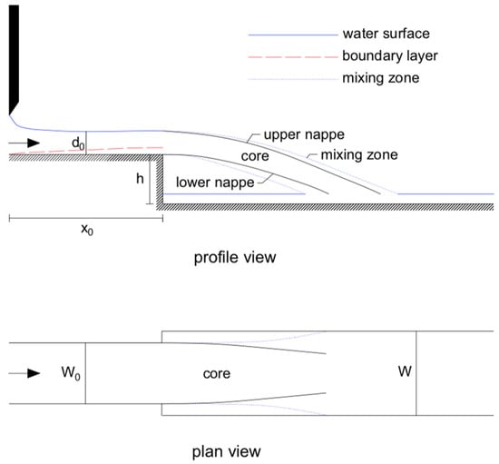 In order to enable the comparison between numerical results with those obtained experimentally, the considered domain essentially matches the experimental facility used by Toombes and Chanson [9]. This includes the 0.237 m (W0) wide channel, with a 0.143 m (h) free overfall at the downstream end, followed by a 0.250 m (W) wide channel. The step is located 0.620 m (x0) downstream of a sluice gate, which controls the flow in the channel (Figure 1).