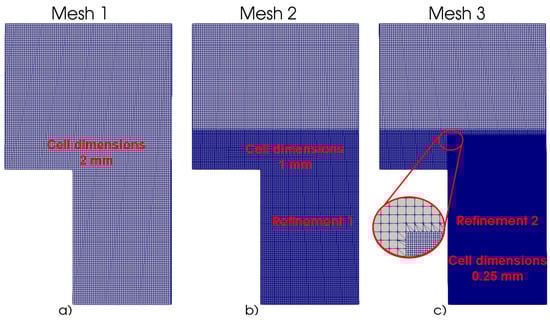 Three meshes were developed to assess the best compromise between results accuracy and computational time effort: (i) first mesh involved a homogenous set of 2.00 mm cells (Figure 3a); (ii) a second mesh was considered, adopting a non-homogenous pattern and local refinement, leading to a cell size of 2.00 mm in the sub-domains distant from the water jet and 1.00 mm in the sub-domains near the water jet, where the mixing zones are likely to develop (Figure 3b); (iii) a third mesh type, involving additional refinement, was then considered in the water jet and vicinity zone, with cells of 0.25 mm (Figure 3c). The studied meshes were generated using blockMesh an OpenFOAM utility. In Table 2 the main characteristics of the analyzed meshes are summarized, cell dimensions in the different zones, number of cells in a jet section, total cell number of the mesh and y+ in the last section of the approach channel are present.