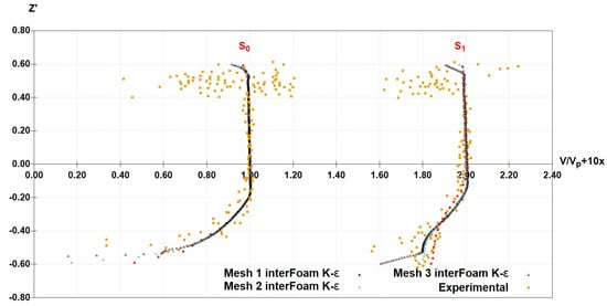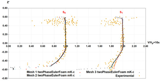The same analysis of the dimensionless velocity profiles was made for the results of the solver twoPhaseEulerFoam with mk-ε turbulent model, Figure 5. The three meshes produce very similar results for the velocity profile at cross-section S0. In the comparison with Toombes and Chanson [9] results, a good agreement is observed. For the cross-section S1, similar to interFoam, mesh 1 produced some deviations from the experimental ones in the lower nappe zone, whereas mesh 2 and mesh 3 present analogous results and an adequate agreement with the experimental velocity profiles.