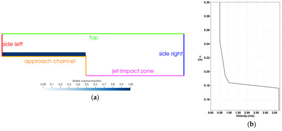 (a) CFD domain boundary definition and initial condition of water volume fraction for simulations with mesh 1; (b) side left velocity profile.