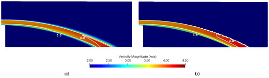 The velocity field along the jet obtained by interFoam solver with k-ε model is presented in Figure 7a. Figure 7b represents the velocity field resulting from the simulation with twoPhaseEulerFoam with mk-ε model. Comparing both results, no significant differences are detected between the solvers. The main difference is at the water–air interface of the jet upper nappe but results are, anyway, in quite similar ranges. This difference can be related to the different approach of each solver in the definition of the water–air interface or mixing zone.
