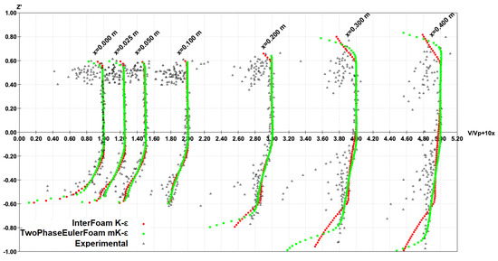 Velocity profiles along the free jet obtained with the two solvers (Figure 8) were compared with the experimental profiles obtained by Toombes and Chanson [9]. Experimental results show the water jet shear effect, which induces a progressive air velocity increase when nearing the water jet, reaching the water velocity in the mixing zone [30]. It must be pointed out that, in the jet’s upper nappe, the experimental flow velocities reveal significant scatter. The authors attribute this scatter to experimental measuring limitations, evidenced by the low cross-correlation signals of the double-tip conductivity probe used to measure flow velocities in the air-water mixing region.