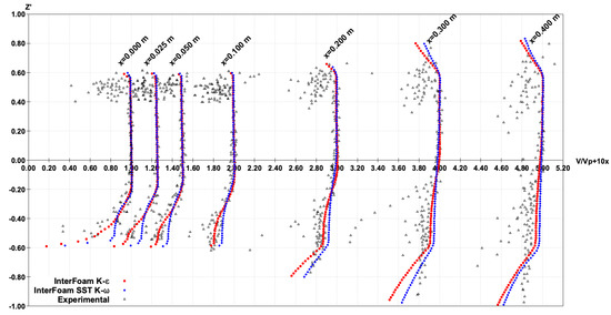 Only mk-ε and SST k- turbulence models were considered for the twoPhaseEulerFoam solver comparative analysis (Figure 10), as the k-ε model used with interFoam had to be discarded due to its trend for numerical instability. SST k- was used to allow the direct comparison between interFoam and twoPhaseEulerFoam solvers. The velocity profiles obtained with both turbulent models are very similar in the core of the jet, however some relevant differences are observed in the upper and lower nappes, the mk-ε model better characterizing these regions. In the upper and lower nappes, the water–air shear mixing zones produced by this turbulence model reveal similar air and water velocities and then, exiting the mixing zone, an abrupt reduction of the air velocity is observed. This behavior is similar to the air boundary velocities characterized in the literature [7,29]. This phenomenon is not captured by SST k-, the reduction of the velocity presenting an approximately linear decay when moving away from the jet axis. Comparing the computational resources used by each turbulent model, mk-ε takes 119 minutes to perform one second of simulation, whereas SST k- model needs 208 min. However, SST k- results for the upper and lower jet nappes reveal a worse agreement with the experimental data. This fact is relevant for the analyses on which turbulent model performs better for the current case study, with mk-ε model results evidencing a better accuracy and requiring half computational time of the SST k- model.