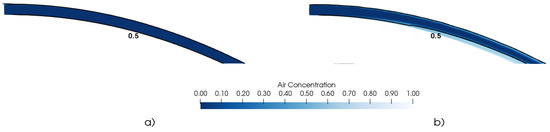 Air concentration along the free jet for Vi = 3.75 m/s and d0 = 0.0296 m: (a) interFoam solver with k-ε; (b) twoPhaseEulerFoam with mk-ε..