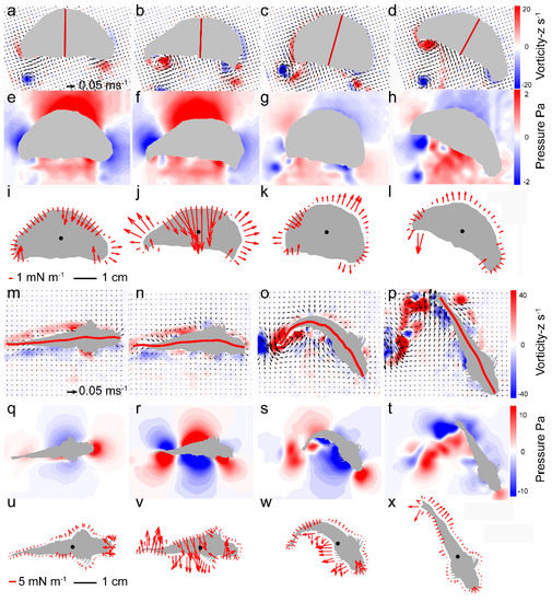 Turning kinematics and fluid pressure for representative medusa (Aurelia aurita, 30° rotation, profiled in Figure A1d in Appendix A) and zebrafish (Danio rerio, 62° rotation, profiled in Figure A2c) turns. The red line shows the midline of the medusa (a–d) and the fish (m–p) throughout the turn, along with PIV vector and vorticity fields. Pressure fields around the medusa (e–h) and the fish (q–t) demonstrate that both animals generate large, asymmetric pressure gradients around their bodies (panels (f) and (r), respectively) before major body orientation shifts (illustrated by the midline position). Force vectors exerted on the animal due to local fluid pressure at the medusa (i–l) and zebrafish (u–x) body surface indicated in red arrows. Note that force vectors, and hence torques, were not calculated on the central region of the oral surface of the jellyfish (the bottom of the bell), as the bell margin in this region protrudes outward from the 2D imaging plane and blocks the view of the subumbrellar surface within the bell cavity, the surface where forces and torques would actually act. Black circles represent the center of mass in each of the latter panels. Note that during peak torque periods, forces along the body stabilize the center of mass while causing rotation of extended body regions such as the bell margin of medusae (j) and caudal fin of fish (v). For jellyfish, the most rapid rotation occurs during bell contraction and bell relaxation may be accompanied by negative torque (l) that brakes bell rotation.