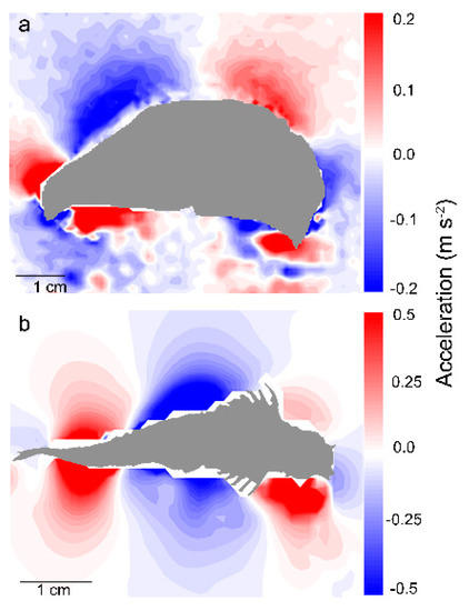 Rapid fluid accelerations during turn initiation give rise to high torque forces along the bodies of jellyfish and fish. Fluid acceleration (positive values correspond to vertical motion toward bottom of page) along animal bodies during turn initiation by medusa (a) Aurelia aurita and zebrafish (b) Danio rerio. Fluid accelerations in both panels are for the same turning sequences as depicted in Figure 2, so that the acceleration field in panel (a) corresponds to the high pressure state of Figure 2f, while panel (b) corresponds to that of Figure 2r.