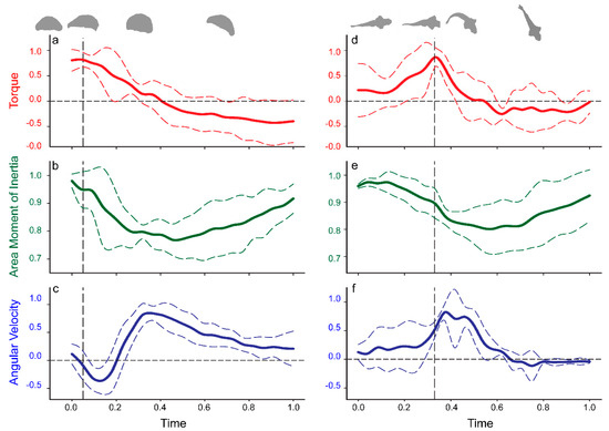 Normalized data for comparison of turning variables between jellyfish and fish. Patterns represent data for replicate individuals during variable turn excursions (medusa Aurelia aurita, panels (a–c), n = 6; bell diameters 1.8–5.4 cm, range in turn angles 13–53°; zebrafish Danio rerio, panels (d–f), n = 4, fish lengths 3.2–4.4 cm, range in turn angles 17–95°). Data for each replicate turn was divided into a uniform number of sample intervals and each variable (time, area moment of inertia, angular velocity and torque) was normalized by the highest value of each replicate sequence so that all variables could be expressed in dimensionless form with a maximum value of 1. Solid curves represent the mean value and dashed lines represent one standard deviation above or below the mean for each sample interval. Note that peak values do not always reach 1 because they are averages of all the turns and not all the peak values occurred in the same time interval for every turn. The original, non-normalized data for each individual replicate are displayed in Figure A1 (medusa) and Figure A2 (zebrafish).