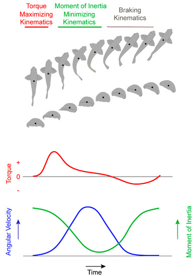 This emphasis on unidirectional swimming belies the fact that actual animal swimming in nature is rarely linear, but instead, is more typically characterized by frequent changes in direction that are mediated by turning maneuvers. The importance of turning has long been documented in studies of aquatic animal ecology. Efforts to model the circuitous trajectories of animals have often focused on Brownian motion or Levy walks [15,16,17]. Regardless of behavioral assumptions about swimmers, many studies of empirically measured pathways have demonstrated that across a variety of spatial scales, swimming animals exhibit predominantly non-linear pathways with frequent turns that change their trajectories. Recognition that swimmers in nature turn frequently is important from a biomechanical perspective because turning maneuvers require rotational motions of the swimmer’s major body axis. The mechanics of rotational motion parallel, but differ from, the more studied mechanics of linear translation by swimmers (Figure 1). In contrast to the large body of knowledge concerning thrust production and force generation during linear swimming, there is not a similar body of mechanical information evaluating torque generation and moment of inertia minimization by flexible bodies such as animal swimmers. Consequently, greater understanding of maneuverability by animal swimmers requires deeper examination of their rotational mechanics to complement existing knowledge of their translational mechanics.